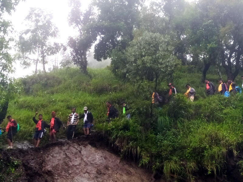 म, पुनम खड्का, अर्जुन शाही, सविन रोका, भागीरथ कँडेल र चन्द्रगिरीको टिम अगाडी थियो सुजन हमाल पनि भेट्न आईपुगे भने अन्य साथीहरु पछाडि नै भए । केही माथि पुग्दा बाटो पुरै पहिरोले लगको थियो, कतै नाम निशान थिएन ।
